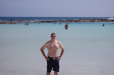 I had booked our tour of Aruba through an independent agent for about half the price that Royal Caribbean charges. We met up Marc Wix of http://www.wixtours.com/. He told us that no one else had booked for the morning and that he needed to move us to the afternoon tour. At first we were a little aggravated but it actually worked out in our favor. We went through the town of Oranjestad and did some shopping before it got too hot. Now later the tour guide told us that it had been so hot and that the old people were predicting that it would rain soon. Hot was 86 degrees. People I had just left San Antonio were it was 100 degrees. Maybe we need to move to the Caribbean- just joking because gas in Aruba was over $7 a gallon. Next we went to Baby Beach. It's called Baby Beach due to the fact that it is only about waist deep without any waves so it is perfect for kids. Here is Brian- It's early in the week so he hasn't gotten aggravated with my picture taking yet.
